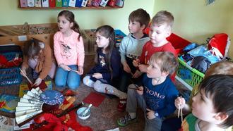 Auch Essen scheint in China nicht ganz so einfach zu sein! Jedenfalls nicht für uns! Messer und Gabeln werden da nicht benutzt. Sandra hat uns Gummibärchen mitgebracht. Wir dürfen ausprobieren, diese mit chinesischen Stäbchen zu essen. Das ist ganz schön schwierig, macht aber auch großen Spaß. Irgendwie gelingt es doch allen, ein Gummibärchen zu erhaschen und in den Mund zu befördern. Zum Abschluss bekommt jedes Kind ein kleines rotes Tütchen oder Säckchen mit chinesischen Souvenirs.
