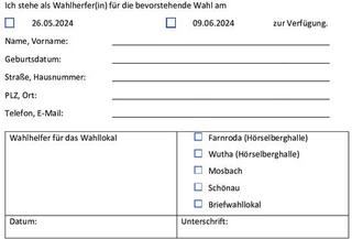 Die Gemeindeverwaltung Wutha-Farnroda sucht für die ordnungsgemäße Durchführung der Kommunalwahlen sowie der Europawahl Wahlhelfer in den 4 Wahllokalen sowie im Briefwahlvorstand. Als Wahlhelfer kann sich jede/r wahlberechtigte/r Bürgerin und Bürger ab 16 Jahren bewerben.