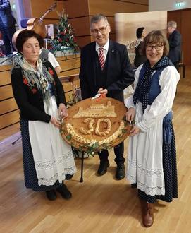 Zahlreiche Vertreter aus den Kommunen und der Wirtschaft sowie auch von Verbänden und Vereinen aus allen Regionen des Wartburgkreises waren gekommen. Herr Krebs und auch Herr Richter konnten über positive Ergebnisse der Jahrzehnte langen Zusammenarbeit berichten. Es wurden Grußworte und Glückwünsche überbracht. Die Schönauer Backfrauen bedankten sich mit einem besonderen Backwerk für die fruchtbare Zusammenarbeit in den 27 Jahren ihres Vereinsbestehens. So konnten mit Landkreis und Sparkasse einige Projekte realisiert werden, wie z.B. die Anschaffung der Vereinstracht oder Einrichtung der Vereinsräume in der Alten Schule.