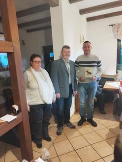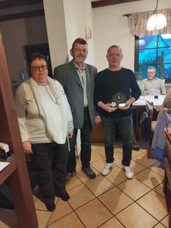 von links: 1. Vorsitzende Beate Lochner, 2. Vorsitzender Mario Lange und Matthias Reum, Auszeichnung für 25 Jahre Zuchtleistung