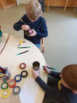 Zuerst wurden die Bambusstäbe ausgehöhlt und vom Staub befreit. Damit sich die Insekten beim Einnisten nicht verletzen, mussten die Enden abgeschliffen werden. Die gesponserten Dosen (Dankeschön an den Hofladen- Direktvermarktung Gebhardt) konnten anschließend bunt bemalt werden. Zum Schluss wurde noch Gips in der Dose angerührt, damit die Stäbe halten und beim Aufhängen des Hotels nicht herausfallen.