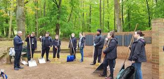 Die Schülerinnen und Schüler wurden mit entsprechenden Arbeitsgeräten ausgestatten und nun konnte die Arbeit beginnen. Der Friedhof wurde von viel nassem Laub und Unkraut befreit und die Gedenktafeln wurden gesäubert. Vorher hatte Herr Riemer bereits das hohe Gras abgemäht. Alle Helfer waren fleißig und packten tatkräftig mit an. Zum Schluss dieses Einsatzes kam der Bürgermeister der Gemeinde Wutha-Farnroda Jörg Schlothauer vorbei, um den Schülerinnen und Schülern sowie Frau Schulze für ihren Arbeitseinsatz zu danken. Dabei machte er deutlich, dass die Säuberung der Gedenkstätte durch die jeweiligen Schüler der Abschlussklasse inzwischen eine schöne Tradition ist und hoffentlich auch weiterhin beibehalten wird.