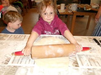Im Gemeindehaus war alles für das große Backen vorbereitet. Zunächst durfte jeder von uns ein Stück Teig kneten und zu einem kleinen Brot formen. Wir erfuhren, dass der Teig aus Natursauerteig bestand und was man dafür für Zutaten braucht. Während das Brot im Ofen backte, konnten wir zunächst erst zuschauen, wie ein Zuckerkuchen entsteht und danach selbst Hand anlegen.