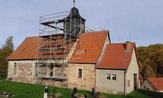 Durch eingedrungene Feuchtigkeit wurden tragende Holzteile des Kirchturmes stark in Mitleidenschaft gezogen, so dass sich dieser ca. 10 cm in westliche Richtung geneigt hatte.