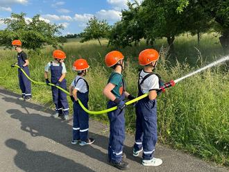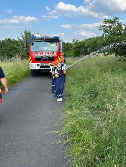 Im Anschluss ging es dann los. Nach einer sehr guten und intensiven Einweisung durch unseren Ortsbrandmeister Florian Stieler begannen wir mit den Löscharbeiten. Die Ausbildung konnten wir ebenfalls dazu nutzen, die Ausbreitung der Apfel-Gespinstmotte einzudämmen.