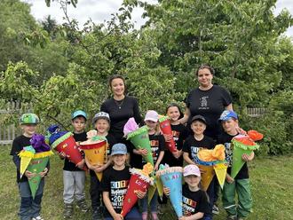 In der gleichen Woche hatten unsere Schulanfänger ihren großen Tag. Ein Ausflug zum Zuckertütenfest war geplant. Nach dem Frühstück ging es mit dem Bus Richtung Thal. Am Schreiberbrunnen ging es zu Fuß weiter durch den Wald, vorbei an Bächen bis zum Mini-a-Thür in Ruhla. Hier gab es viel zu entdecken auch unseren Schlossturm. Ein leckeres Mittagessen wurde nur für uns vorbereitet. Auf dem Spielplatz und der Hüpfburg haben wir uns nochmal richtig ausgetobt, bis es mit dem Bus wieder zum Kindergarten ging. Nach einem tollen Eisbecher war es dann soweit, unsere Zwerge haben die Zuckertüten gepflückt und jeder Schulanfänger hat eine bunte Überraschung mitgenommen.
