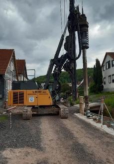 In unserer Baustelle gehen die Arbeiten weiter gut voran. Im Bereich des Verbindungsweges Theo-Neubauer-Straße zur Kirchstraße (Seebachs Gasse) stehen die Kanalarbeiten kurz vor dem Abschluss. In der Theo-Neubauer-Str. sind von 960 erforderlichen Bohrpfählen 750 fertiggestellt und im ersten Bauabschnitt wurde bereits der Kopfbalken auf die Pfähle betoniert.