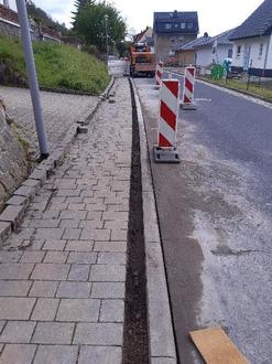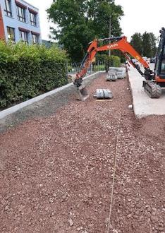Momentan wird im Bereich der Grundschule der Fußweg erneuert und die Ausfahrt der Bushaltestelle für den Busverkehr umgestaltet.