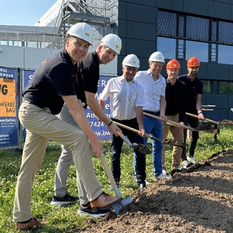 Zum symbolischen Spatenstich für das Bauprojekt bewegen (v.l.) Friedrich-Wilhelm Reese und Norbert Adamzyk (Geschäftsführung SSV-Kroschke), Jörg Schlothauer (Bürgermeister der Gemeinde Wutha-Farnroda), Frithjof von Kessel (Geschäftsführer der Klaus Kroschke Holding), Carsten Dotterweich (Geschäftsführer BWG) und Matthias Freund (Projektleitung BWG) die erste Erde.