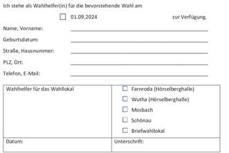 Die Gemeindeverwaltung Wutha-Farnroda sucht für die ordnungsgemäße Durchführung der Landtagswahl Wahlhelfer in den 4 Wahllokalen sowie im Briefwahlvorstand. Als Wahlhelfer kann sich jede/r wahlberechtigte/r Bürgerin und Bürger ab 16 Jahren bewerben.