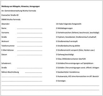Nutzen Sie bitte untenstehendes Formular, um Ihre Feststellung an uns heranzutragen oder informieren Sie uns per E-Mail unter info@wutha-farnroda.de