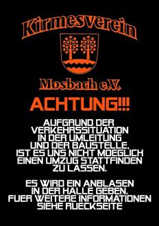 Auch in diesem Jahr wird in Mosbach Anfang Oktober Kirmes gehalten. Allerdings kann leider nicht am bekannten Ablauf festgehalten werden: So ist es aufgrund der Baustelle in der Theo-Neubauer-Straße nicht möglich, mit dem traditionellen Umzug in das Kirmeswochenende zu starten. Ein Umzug durch das halbe Dorf stand für die Kirmesgesellschaft, die Organisatoren und alle weiteren Mitwirkenden nicht zur Debatte. Daher wird bereits am Freitag, dem 06. Oktober 2023, zum Kirmesgottesdienst um 17 Uhr in die Kirche zu Mosbach geladen. Daran angeschlossen findet circa 17:45 Uhr der alljährliche Tanz unter den Linden statt und es wird bereits ab 18 Uhr ein Anblasen in der Triftberghalle geben. Begleitet wird dies von der Blaskapelle TMZ Röhrda, welche die Verantwortung für musikalische Untermalung des Abendprogrammes an die Band Meilenstein übergibt.