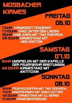 Am Samstag, dem 07. Oktober 2023, beginnen die Kirmesburschen gemeinsam mit der Kapelle der Feuerwehr Breitungen ihr Umspiel durch das Dorf. Die ersten Mosbacher dürfen sich bereits ab 8 Uhr auf ein eigenes Ständchen freuen. Ab 20 Uhr lädt der Kirmesverein zum Tanz in die Triftberghalle mit Antitoxin ein.
