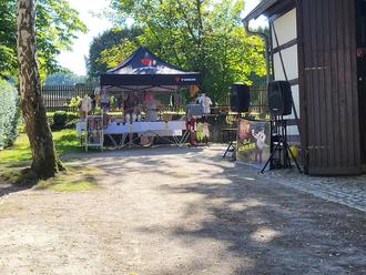 Außerdem gab es auf dem Gelände einen kleinen Markt mit selbstproduzierten Waren aus der Region. Leider gab es im Vorfeld aus organisatorischen Gründen einige Absagen, so dass der Markt etwas kleiner als geplant ausfiel. Dennoch wurde den Besuchern einiges an Abwechslung geboten. Für die musikalische Begleitung sorgte Fabian Stein und die Laienspielgruppe „nie erwachsen“ spielte ihr Stück „Der grobe Gottlieb“.