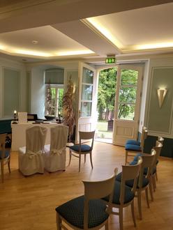 Es erwartet Sie nicht nur ein repräsentatives Trauzimmer, mit einem traumhaft schönen Ausblick zum Schlosspark, bei sonnigen Wetter verheiraten wir Sie gerne bei geöffneter Tür zur Freitreppe. Der Gesang der Parkvögel, das perfekte Licht der Sonne und ein zartes Glockenspiel der Turmuhr begleitet Ihre Trauung.