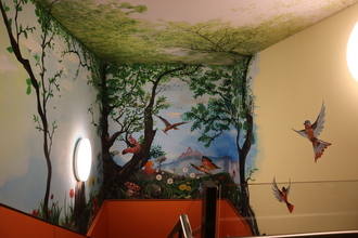 Der nördliche Trakt des Gebäudes wurde so gestaltet, dass sich hier überwiegend die Funktionsräume und ein Teil der Gruppenräume befinden. Eine gut durchdachte Anordnung der Räume ermöglicht nach Fertigstellung der gesamten Baumaßnahme, dass der Mitteltrakt, der im Obergeschoss ein Kinderrestaurant und Turnraum beinhaltet, perspektivisch als zentrale Anlaufstelle für alle Gruppen genutzt werden kann. Das Wandgemälde im sanierten Treppenhaus hat der Künstler Laszló Czene gestaltet. Er lebt in unserer Stadt und hat bereits mit anderen Aktionen wie Graffiti-Projekten mit dem Kinder- und Jugendfreizeittreff auf sich aufmerksam gemacht. Weil das Motiv mit Tieren und bekannten Plätzen unserer Stadt bei den Kindern so gut ankommt, ist geplant, dass Laszló Czene auch das zweite Treppenhaus gestaltet.