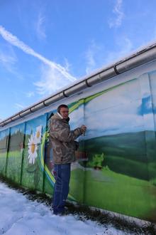 Auf einer Länge von 22 Metern wird nun an der Rückwand der zum Sportplatz gehörenden Garagen deutlich, wie schön es in jeder einzelnen Jahreszeit in unserer Heimatstadt mit ihrer tollen Umgebung ist. Frühling, Sommer, Herbst und Winter sind die Motive des 66 Quadratmeter großen Kunstwerks. Mit Sprühdose, Pinsel, Marker und Schablone hat Thorsten Grützmann es gestaltet - und mit sehr viel Zeit. Vor mehr als einem Jahr hatte er damit begonnen und parallel zu seinen anderen Projekten immer wieder daran gearbeitet - insgesamt rund zweieinhalb Monate.