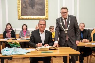 Altbürgermeister Richard Rossel hat sich gestern Abend bei einer Feierstunde des Stadtrats ins Goldene Buch der Stadt Zella-Mehlis eingetragen. Das hatte der Stadtrat bereits vor seinem Ausscheiden aus dem Amt einstimmig befürwortet.