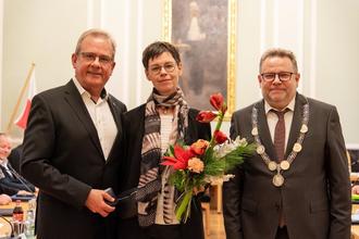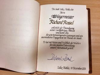 „Dein Herzensprojekt für die Entwicklung in Südthüringen als Gründungsvater und ständiger Motor war die Gründung der KAG „Entwicklung Oberzentrum Südthüringen“. Ich verspreche: Wir machen konsequent weiter!“, so Torsten Widder. Richard Rossel stehe wie kein anderer für ein innovatives, zukunftsfähiges und starkes Zella-Mehlis und habe für die Entwicklung unserer Heimatstadt einen wertvollen und nachhaltigen Beitrag geleistet. „Im Namen der Stadt Zella-Mehlis zolle ich Ihnen Herr Alterbügermeister, dir, lieber Richard Rossel, meinen tiefen und aufrichtigen Respekt und meine Anerkennung für diese große Lebensleistung“, sagte der Bürgermeister, bevor er den Altbürgermeister zum Eintrag ins Goldene Buch nach vorne bat.