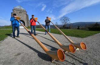 Das Zella-Mehliser Alphornensemble mit Horst Großgebauer, Siegfried Walter und Thomas Darr musiziert nun wieder jeden Freitag ab 9 Uhr am Denkmal auf dem Lerchenberg. Vorausgesetzt das Wetter ist für ihre fast vier Meter langen Instrumente aus Holz nicht zu unpassend, möchten sie ein wenig alpenländisches Flair auf den Lerchenberg zaubern.