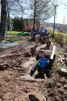Aufgrund der recht steilen Hanglage bestand hier bei nassem Wetter schon seit langer Zeit das Problem, dass das Wasser sich seinen Weg Richtung Hauptstraße sucht und dabei die Wege ausspült und in die Stützmauer eindringt. Mit unterirdisch verlegten Entwässerungsrohren wird das Wasser in Zukunft aufgefangen und abgeleitet, so dass die Wege und die Mauer nicht mehr in Mitleidenschaft gezogen werden.