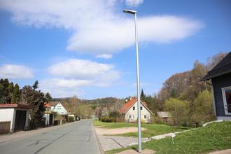 Die normgerechte, effiziente und energiesparende Neuanlage der Straßenbeleuchtung ist jetzt an der Aschenhofstraße im Ortsteil Benshausen fertiggestellt worden. Die LED-Leuchten sorgen auf dem 940 Meter langen Straßenabschnitt für Sicherheit. In der verkehrsarmen Nachtzeit wird die Leistung zusätzlich reduziert.
