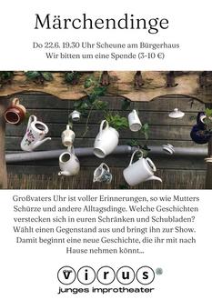 Die Gruppe Virus, das junge Improvisationstheater aus Zella-Mehlis lädt ein zur Vorstellung „Märchendinge“. Julia Pöhlmann informiert: Der Improtheater-Nachwuchs traut sich was und bringt ein ganzes Märchen am Stück auf die Bühne! Wir sind gespannt und aufgeregt und freuen uns auf märchenhaftes Publikum!