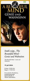 Am Mittwoch ist Kinotag im StuKi von Provinzkultur. Am 17. Juli steht der Film „A Beautiful Mind - Genie und Wahnsinn“ auf dem Programm. In der Filmbiografie aus dem Jahr 2001 wird die reale Lebensgeschichte des insbesondere für die Spieltheorie bekannten Mathematikers John Forbes Nash (gespielt von Russell Crowe) skizziert. Der Film von Ron Howard basiert auf dem Buch von Sylvia Nasar.