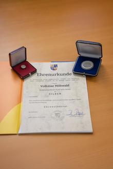 Die Auszeichnung erfolgte gemäß der Ehrenordnung der Stadt Zella-Mehlis mit der Ehrennadel in Silber in Verbindung mit einer Ehrengabe. Bei der Ehrengabe handelt es sich um eine Medaille, die vom Zella-Mehliser Medailleurmeister Helmut König gestaltet wurde - ebenso wie die Ehrennadel. Wenn Volkmar Möhwald eines Tages aus dem Stadtrat ausscheidet, darf er gemäß der Ehrenordnung den Titel „Ehrenstadtrat“ tragen.