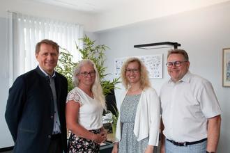 Die Fachbereichsleiter Jens Ehle und Nadine Wirth gemeinsam mit Fachdienstleiterin Nicole Heym und Bürgermeister Torsten Widder (links).