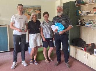 Carl Köhler übergibt die von ihm erschwommenen Freibadtickets im Beisein von Marlies Schlütter und Regina Künzel von den Eisbären an Christoph Schmidt, Leiter des Regenbogendorfs (von links).