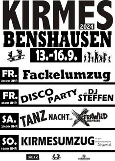 Die Kirmesgesellschaft Benshausen läd Sie herzlich ein zur diesjährigen Kirmes, die vom 13. bis 16. September 2024 stattfindet. Freuen Sie sich auf ein buntes Programm für Jung und Alt.