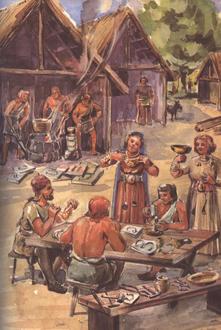 Zeichnung „Beim Bronzeschmied“, aus Schlette, Friedrich: „Auf den Spuren unserer Vorfahren“, Berlin 1982, S. 43.
