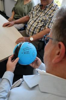 Im Gespräch mit Herrn Weiß erfuhr er von der großen Sport- und insbesondere Fußballbegeisterung von Torsten Widder - und auch von einer kleinen Anekdote: Widders Vater, selbst Torhüter, trug einst den Spitznamen „Jaschin“, in Anlehnung an den legendären Weltklasse-Keeper Lew Jaschin, der 1963 als einziger Torhüter den Ballon d’Or gewann. Die Idee für das Präsent war geboren - ein Fußball mit persönlicher Widmung des Ehrenbürgers.