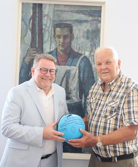 Bis das Paket eintraf, brauchte es etwas Geduld. Doch nun konnte Herr Weiß den Ball offiziell überreichen. Er wird künftig einen Ehrenplatz im Büro des Bürgermeisters finden - direkt neben der historischen Jülich-Uhr und in direkter Nähe zu einem Porträt von Helmut Recknagel, das den Skispringer zeigt.
