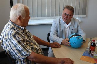 Überreicht wurde das besondere Präsent vom langjährigen Freund Recknagels, Herrn Weiß vom SC Motor Zella-Mehlis. Der Ball mit persönlicher Widmung wird künftig einen Ehrenplatz im Büro des Bürgermeisters finden.