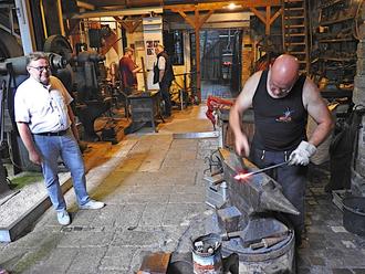 Über die Abläufe des sogenannten Gesenkschmiedens, das dem Technikmuseum seinen Namen gibt, konnten sich Besucher bei Frank Eiselt, Mitarbeiter der städtischen Museen Zella-Mehlis, ins Bild setzen. Anders als beim Schmied am Amboss wird das Werkstück hierbei nicht durch zeitaufwendiges händisches Verformen des Schmiedeeisens, sondern durch ein gezieltes Aufeinanderschlagen zweier Werkstück-Negative, den Gesenken, hergestellt, was in Zeiten aufkeimender Industrialisierung Anfang des letzten Jahrhunderts große Stückzahlen und Serien in kurzer Zeit ermöglichte. Die Zuschauer staunten nicht schlecht, welche Wucht und Lautstärke dabei durch die 6 gewaltigen Brettfallhämmer der Schmiede erzeugt wurden und konnten gut nachvollziehen, warum die Gründerfamilie Wahl einst aus der Stadt ins Lubenbachtal zog - der Betrieb war schlichtweg zu laut für die städtische Umgebung.