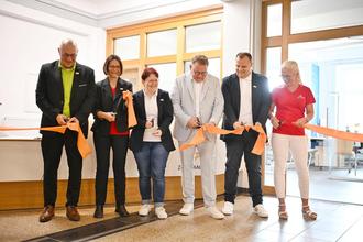 Gemeinsam schneiden sie zur Eröffnung das Band durch: Oliver Gießler, Antje Lotz, Kerstin Wahl, Torsten Widder, Etienne Walther und Nadine Wirth (von links).