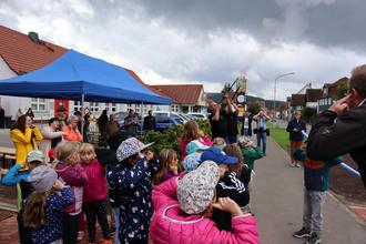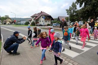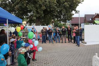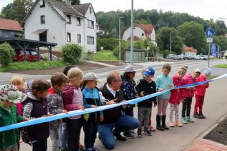 Zuvor hatte eins der Kinder mit dem Bürgermeister symbolisch ein Band durchgeschnitten, um den „Zebrastreifen“ freizugeben.