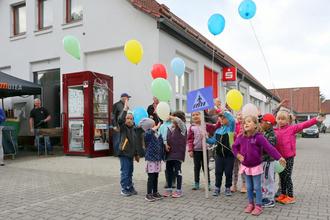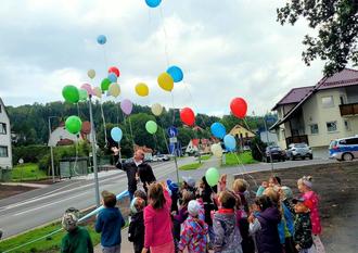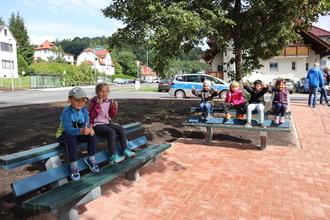 Nachdem die Kindergartenkinder mehrfach geübt hatten, wie der Fußgängerüberweg korrekt überquert wird und wie man sich an der Bushaltestelle richtig verhält, probierten sie natürlich auch diese neuen Bänke aus - auch wenn sie wohl künftig eher ein etwas älteres Publikum anziehen werden. Bereits vor der Einweihung von Bushaltestelle und Zebrastreifen hatten die Kinder aus dem Kindergarten „Sandhasennest“ sowie aus der Grundschule Benshausen Bürgermeister, Stadtratsmitglieder und baubeteiligte Unternehmen mit passenden Liedern aus der Verkehrserziehung erfreut. Die Mitglieder des Schützenclubs SC Tell sorgten nicht nur fürs leibliche Wohl, sondern auch für viel Aufmerksamkeit: Sie feuerten zum festlichen Anlass Böllerschüsse ab. Die Kinder ließen viele bunte Luftballons in den Himmel steigen und nutzten anschließend ausgiebig die Möglichkeit, ein riesiges Gemälde am Bauzaun der Bauunternehmung Ernst Wenk entstehen zu lassen.