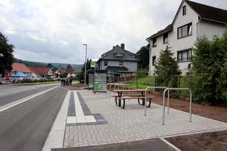 Sie wurde 275 Meter entfernt von ihrem bisherigen Standort eingerichtet und damit ins unmittelbare Umfeld der Schule gerückt. Der Fußgängerüberweg ermöglicht es Schulkindern aber natürlich auch allen anderen Fußgängern, die Straße sicher zu überqueren. Auf der anderen Straßenseite ist eine neue fußläufige Anbindung an den Parkplatz am Dorfgemeinschaftshaus sowie an den neuen Gehweg an der Schulstraße geschaffen worden. Am Spielplatz sind neue Bänke extra für die Jugend aufgestellt worden, bei diesen Modellen ist es bequem, auf der Lehne zu sitzen.
