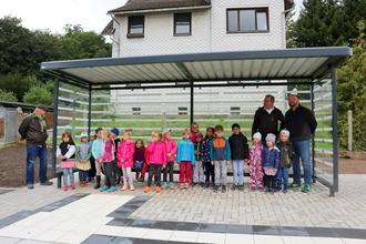 Die wichtigsten aktuellen und künftigen Nutzer waren bei der Einweihung der neuen Bushaltestelle und des Fußgängerüberwegs im Ortsteil Benshausen dabei: Grundschüler und Kindergartenkinder haben beides gemeinsam mit Bürgermeister Richard Rossel und zwei Polizisten ausprobiert und auf Anhieb für gut befunden.