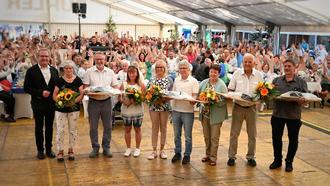 Zum zweiten Mal hat Bürgermeister im vollbesetzten Festzelt beim Stadtfest den Engagementpreis der Stadt verliehen. In diesem Jahr wurden damit ausgezeichnet: Sibille und Adalbert Heß, Romy Kafka, Christine und Horst Partisch, Gabi und Dieter Weiß sowie Jürgen Bauroth.