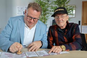 Bürgermeister Torsten Widder (links) stempelt das Heft des Pilgers Maik John.