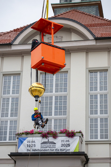 Es war das Highlight zum Rathausjubiläum: Die goldene Turmkugel wurde vom Rathausdach heruntergehoben und die darin befindliche Zeitkapsel geöffnet. Zum Vorschein kamen verschiedene Dokumente aus den vergangenen 100 Jahren. Nach einem aufregenden Nachmittag fanden weitere Dokumente, die vom Jahr 2025 und dem Rathausjubiläum zeugen, ihren Weg in die Zeitkapsel.