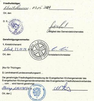 [Nur für Thüringen: Die Rechtsaufsichtsbehörde, die für die Kommunalgemeinde zuständig ist, auf deren Gebiet sich der Friedhof befindet, hat am 04.11.2024 die erforderliche Genehmigung erteilt.]
