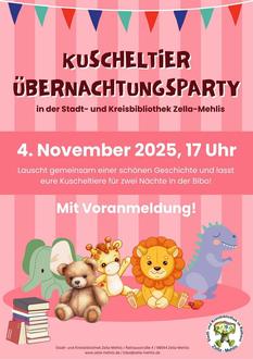 Bringt uns euer Kuscheltier am 4. November zu uns in die Bibliothek, erlebt gemeinsam um 17 Uhr eine spannende Vorlesestunde und verabschiedet euch dann von euren Lieblingen. Am 6. November dürft ihr sie wieder abholen. Die Kuscheltiere erleben eine spannende Zeit voller Abenteuer bei uns und lernen die Geheimnisse der Bibliothek kennen. Als Beweis für die Tapferkeit der kleinen Helden erhalten eure Stofftiere eine eigene Urkunde und ein Poster voller Erinnerungen.