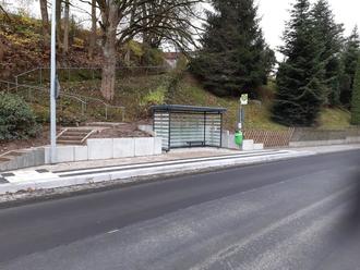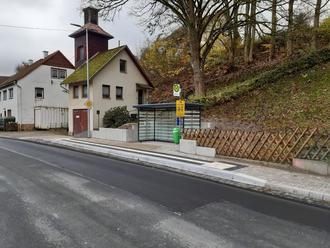 Die Einrichtung einer behindertengerechten Bushaltestelle an der Ebertshäuser Hauptstraße ist abgeschlossen. Damit gibt es nun auch hier für den überörtlichen Linienverkehr eine Haltestelle, die den aktuellen Standards auch im Hinblick auf die Barrierefreiheit entspricht. Sie wurde auf einer Länge von 18 Metern mit einem Bussonderbord gebaut. Gehweg und Wartebereich wurden mit einem taktilen Leitsystem ausgestattet. Durch diese kleinen Erhebungen auf dem Pflaster finden sich Sehbehinderte besser zurecht. Es gibt eine kleine Buswartehalle, Sitzmöglichkeiten und einen Papierkorb. Eine gesonderte Busbucht war aus Platzgründen an dieser Stelle leider nicht möglich, deshalb und aus Gründen des Arbeitsschutzes war auch die Vollsperrung erforderlich.