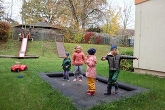 Einen zusätzlichen Sandkasten mit Spielgerät gibt es nun für die Allerjüngsten, für die Kinder im Krippenalter. Direkt neben ihren Gruppenräumen lockt nun die kleine Rutsche, auf die man ganz abenteuerlich hochklettern kann. Etwas versteckt, aber doch sehr beliebt ist das neue Trampolin. Es ist so groß, dass mehrere Kinder gleichzeitig hüpfen können - und das machen sie natürlich sehr gerne!