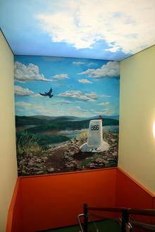 Schon vor einigen Wochen war das zweite Treppenhaus im Gebäude fertig geworden. Es ist, wie schon das erste, vom Zella-Mehliser Künstler Laszló Czene gestaltet worden und zeigt die Spitze des Ruppbergs. Wie stolz werden die Kinder sein, wenn sie den Berg erst selbst erklommen haben und den echten Gipfelstein sehen! Außerdem gibt es im Bild viele kleine Tierchen zu entdecken, das ist immer wieder eine schöne Freude für die Kinder und die Erwachsenen, die sie aus der Einrichtung abholen.